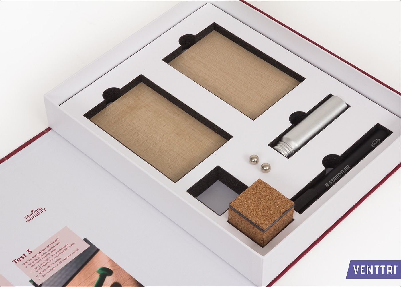 Een slimme toevoeging is de magneet die in het schuim verwerkt zit, waardoor de ijzeren balletjes op hun plek blijven zitten tijdens transport.