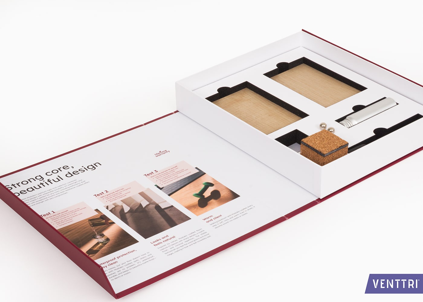 Binnenin is gekozen voor een schuiminterieur, afgewerkt met een wit kartonnen cover. Dit geeft de binnenzijde een luxe uitstraling en zorgt ervoor dat de samples en producten strak op hun plek blijven zitten. Het schuim is op maat gefreesd zodat de inhoud netjes en veilig gepresenteerd wordt.