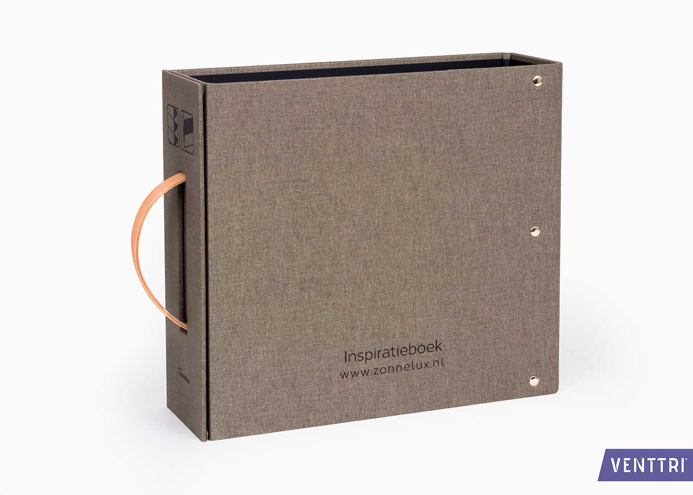 Voor Zonnelux ontwikkelden we een robuust en stijlvol inspiratieboek dat niet alleen stevig is, maar ook luxe uitstraalt. De map is vervaardigd uit 4 mm karton, volledig omplakt met linnen en aan de binnenzijde afgewerkt met zwart papier voor een strak en tijdloos geheel.