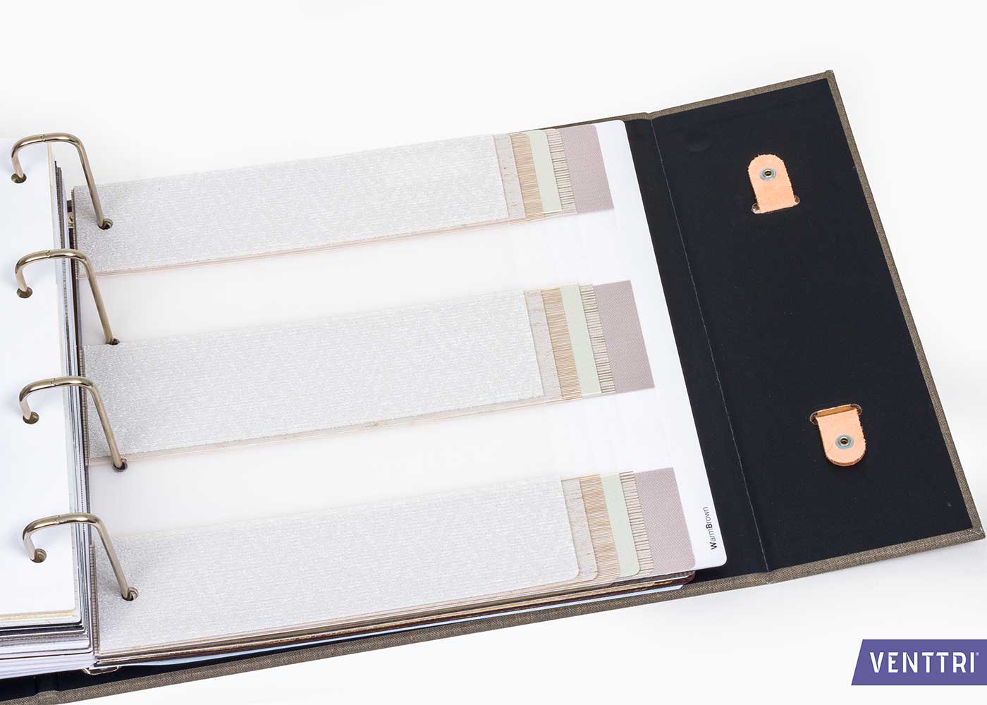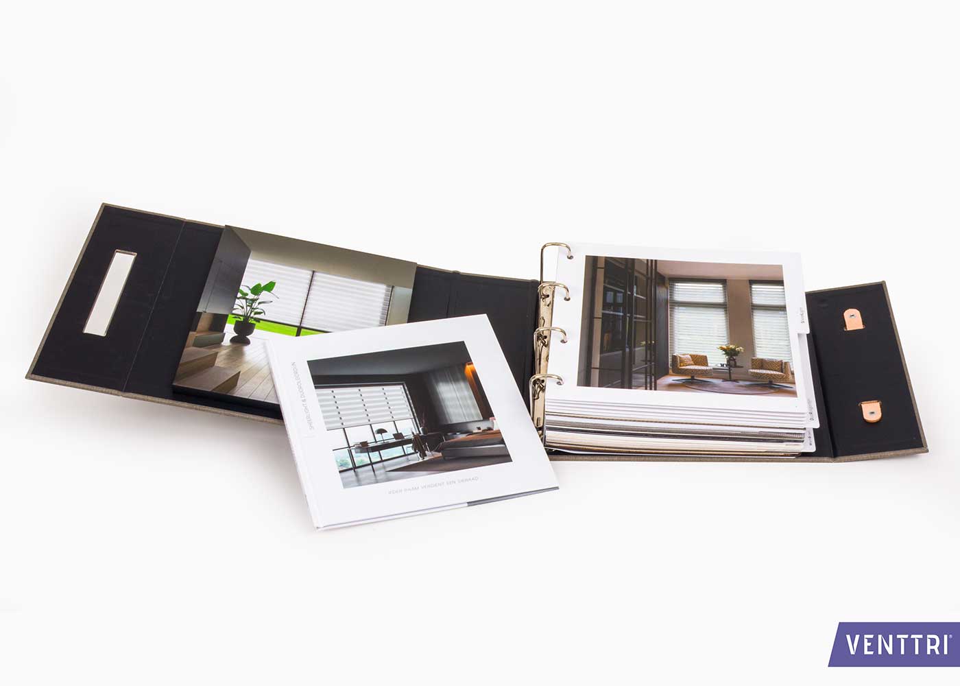 Aan de linkerzijde is een speciale inzet aangebracht waarin een extra sfeerboek netjes kan worden opgeborgen. Rechts bevindt zich een hoogwaardige ringmechaniek met stevige 2 mm schutbladen, gevuld met inspiratiebeelden en zorgvuldig gesorteerde rolgordijnstalen.
