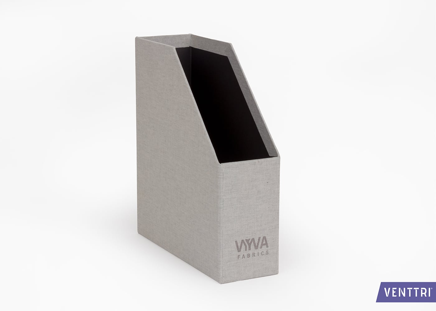 Voor Vyva Fabrics realiseerden we een robuuste en stijlvolle ordnerhouder (ook wel foedraal genoemd). De basis is gemaakt van stevig zwart karton, dat aan de buitenzijde is bekleed met een grove linnen. De binnenzijde is strak afgewerkt in zwart, wat zorgt voor een rustige en luxe uitstraling.