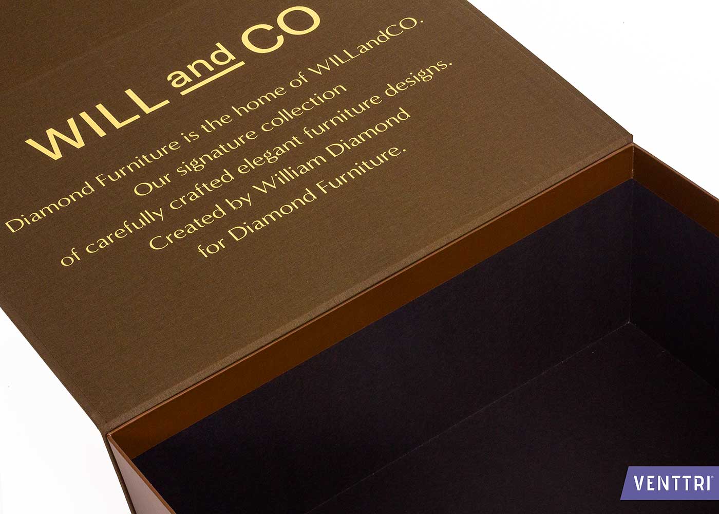 De sluiting werkt met een onzichtbaar verwerkte magneet, zodat de box strak en naadloos sluit. Een opvallend accent vormt de goudfolie opdruk op de voorzijde – een detail dat de presentatiebox extra elegant en premium maakt.