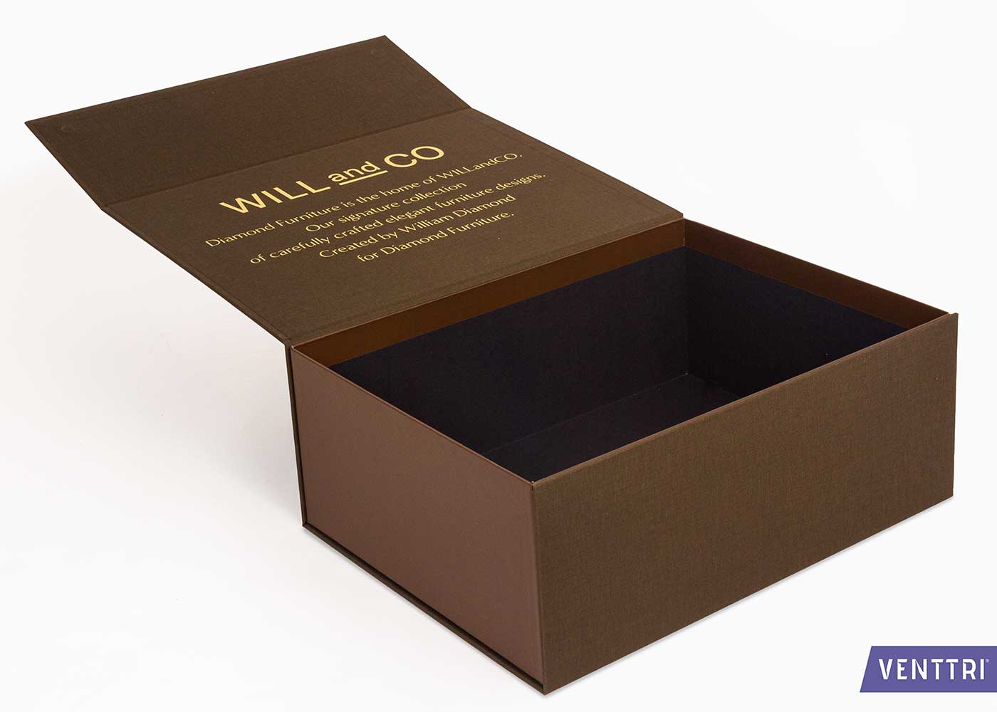 De stevige basis is vervaardigd uit zwart karton, volledig omplakt met mat bruin drukwerk. Zo ontstaat een perfecte balans tussen duurzaamheid, strak design en hoogwaardige uitstraling.